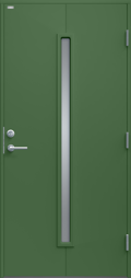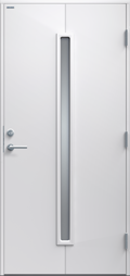 Ytterdörr i modern stil med sparsmakad dekor och smalt, stående klarglas.
